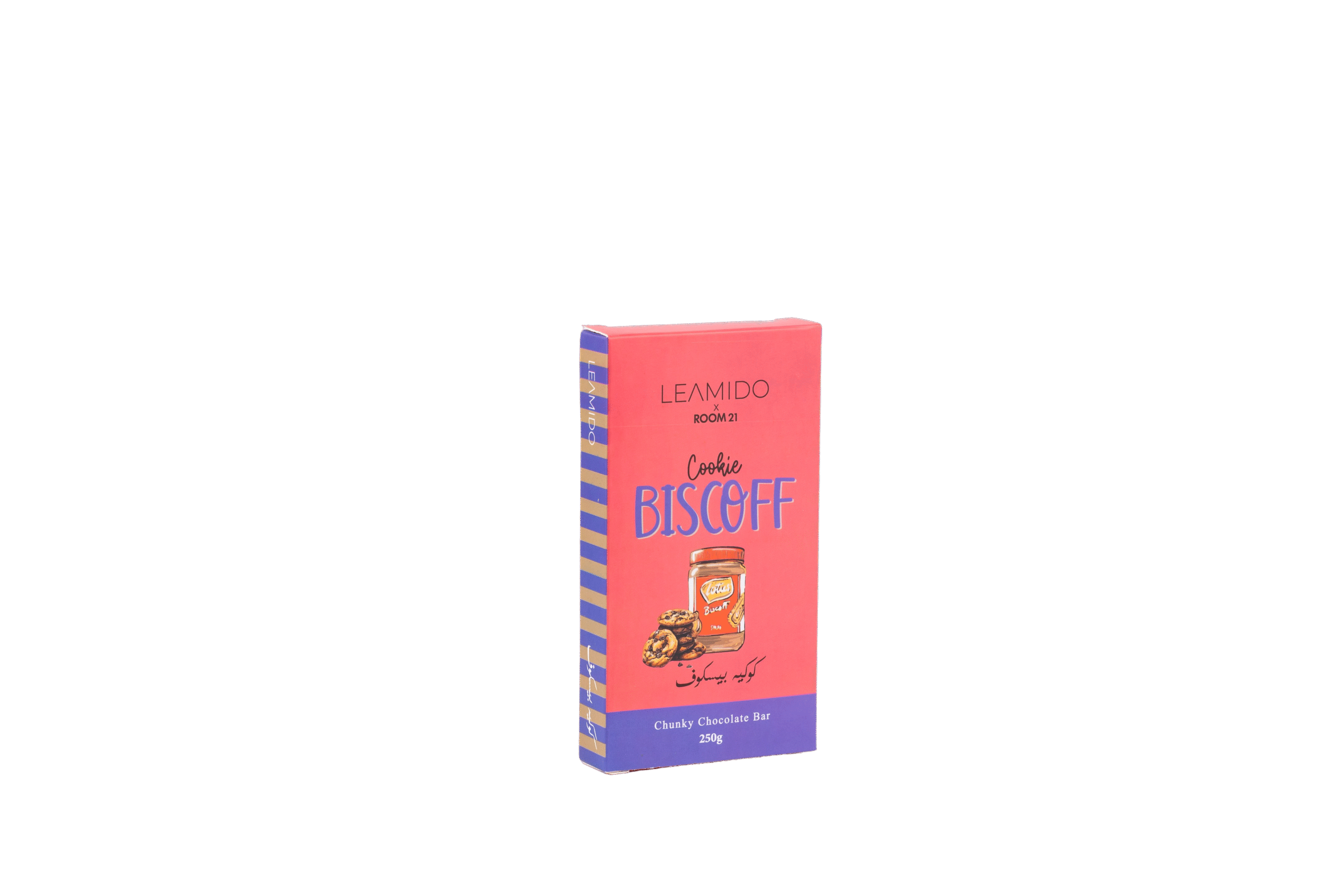 Tablette de chocolat au lait, renfermant un coeur de crème Spéculoos et de knafeh croustillante, sur une base de Biscoff 80 DH