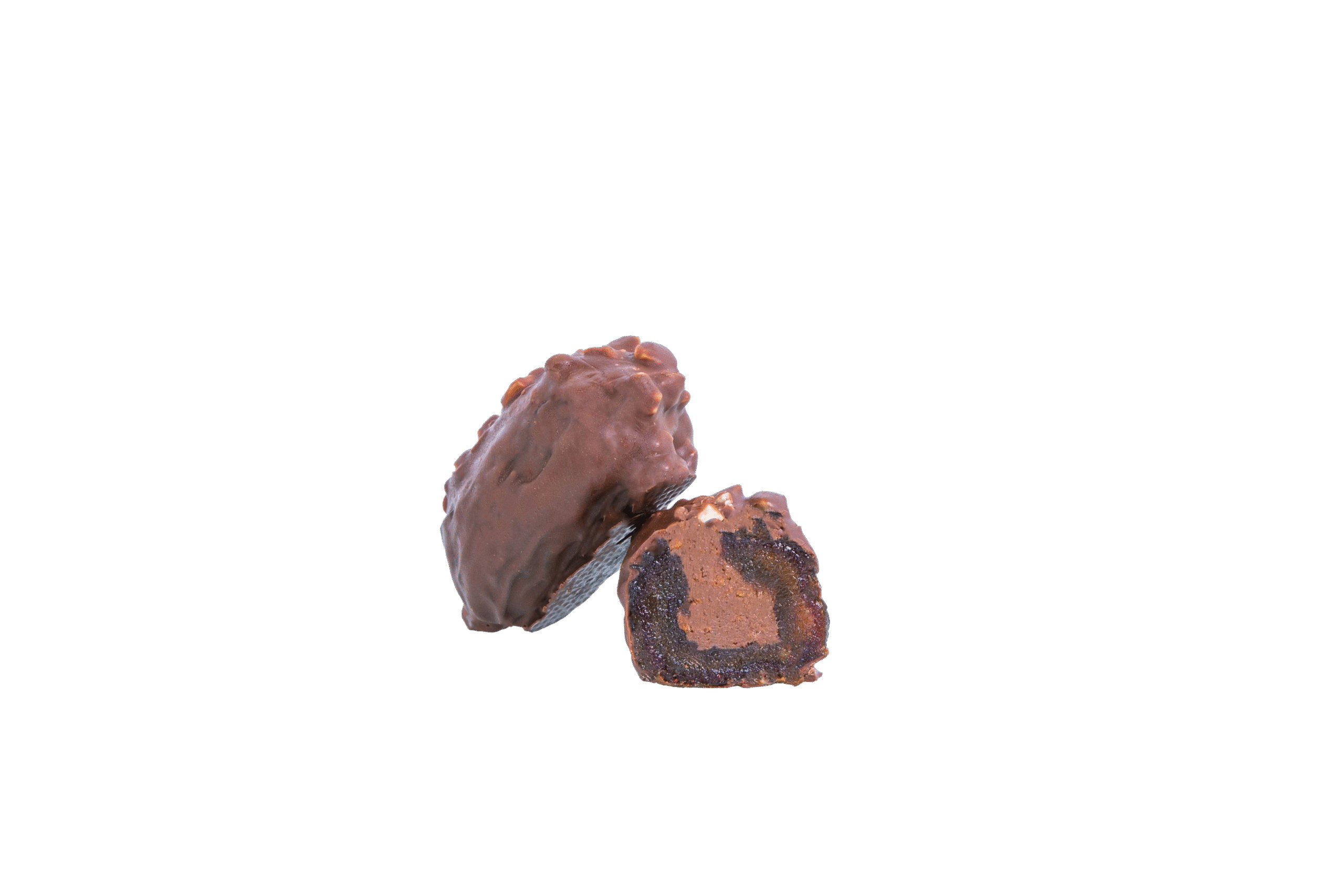 Dattes Medjool fourrées à la crème onctueuse de gianduja, enrobées de chocolat au lait délicatement parsemées de noisettes concassées