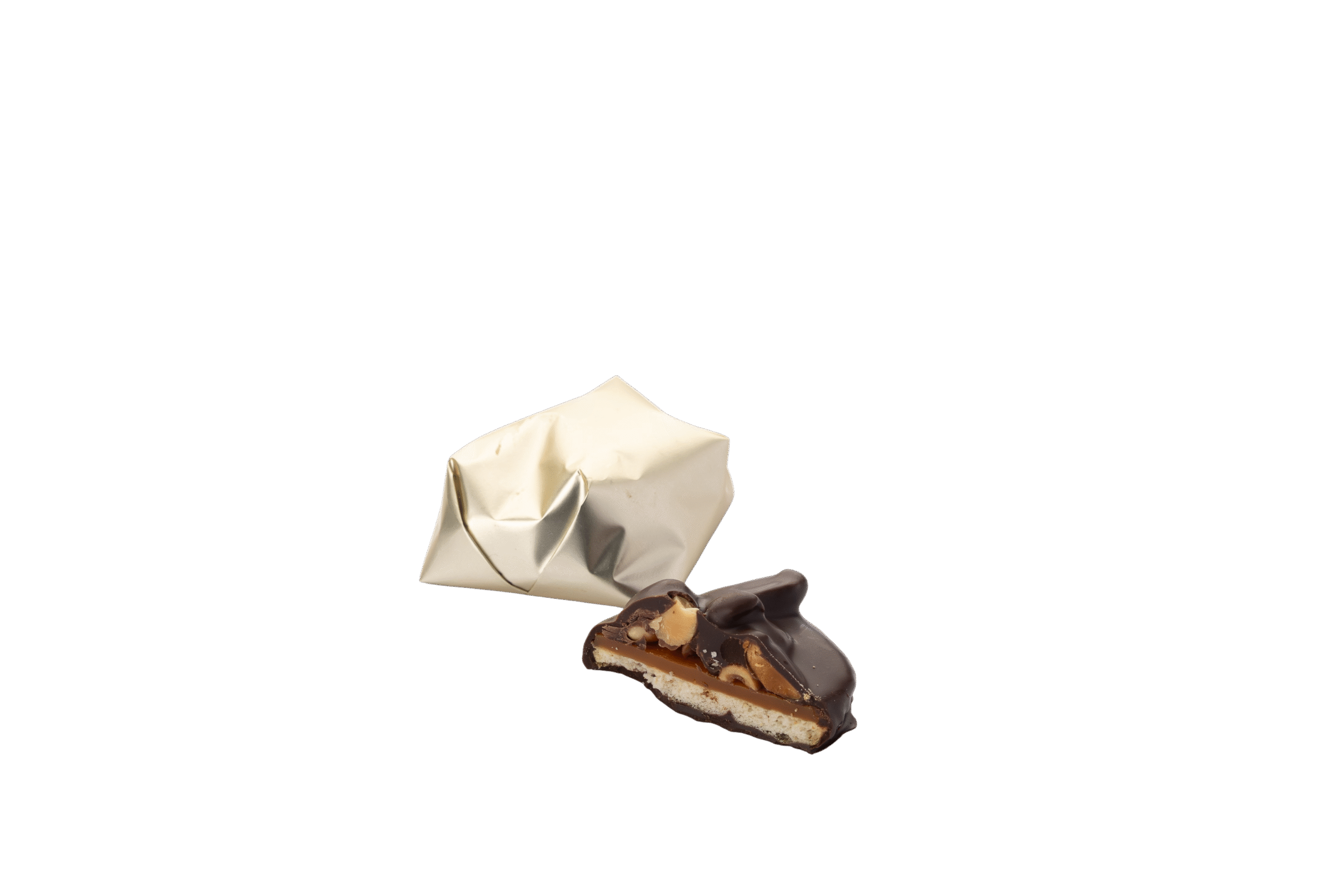 Biscuit salé croustillant, caramel chewy, cacahuètes, chocolat noir
