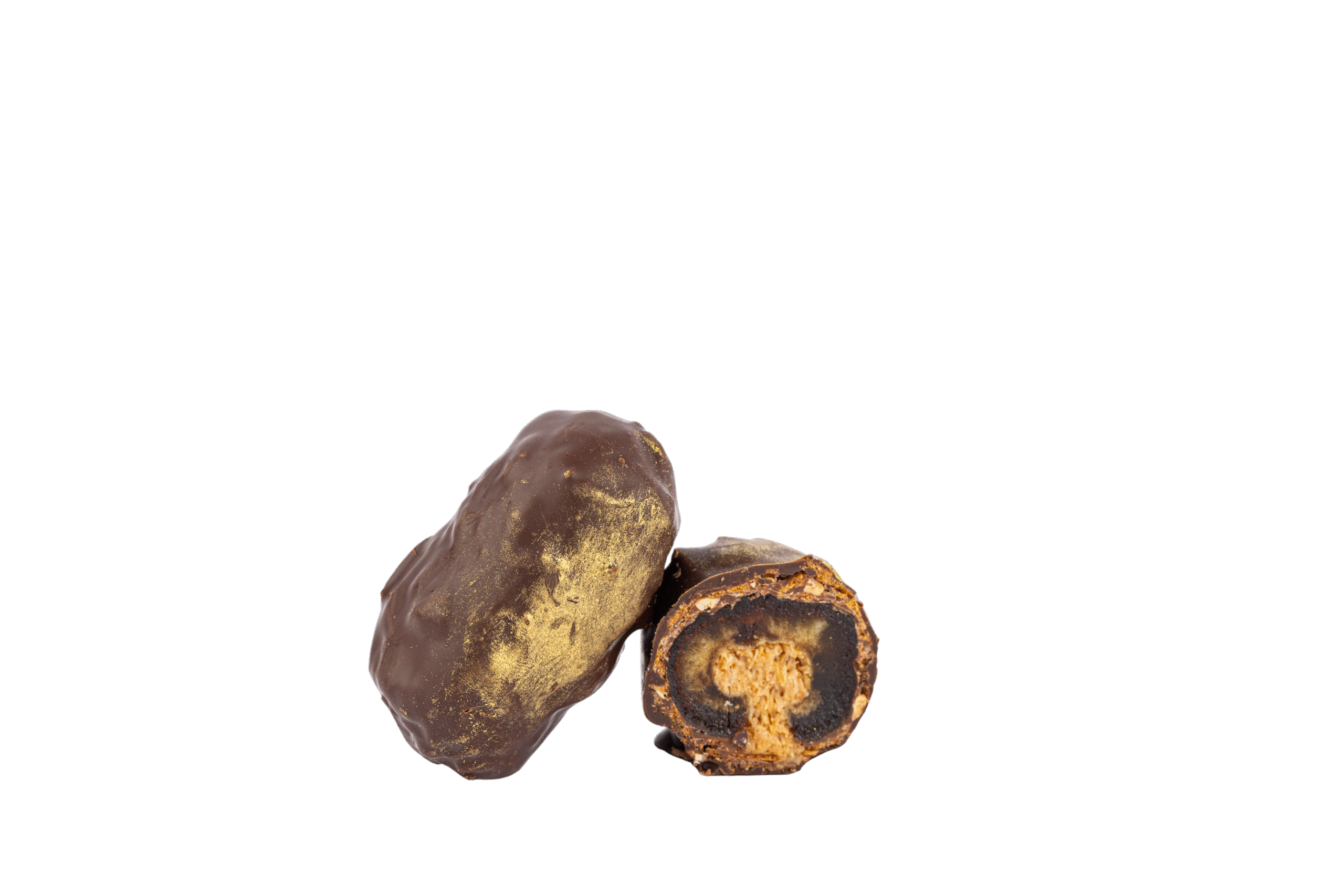 Dattes Medjool au coeur de crème onctueuse gianduja, mêlée à un croustillant de knafeh dorée, enrobées de chocolat noir et parsemées d’amandes concassées
