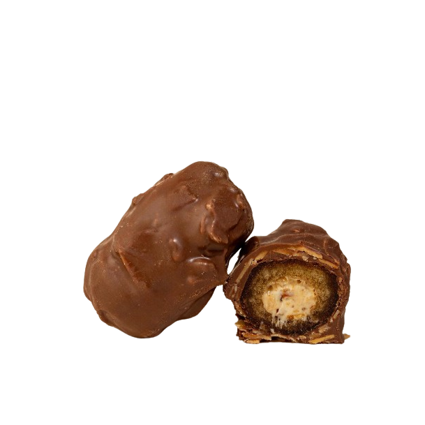 Dattes Medjool garnies d’un nougat infusé au gingembre et d’une crème onctueuse au café, enrobées de chocolat au lait