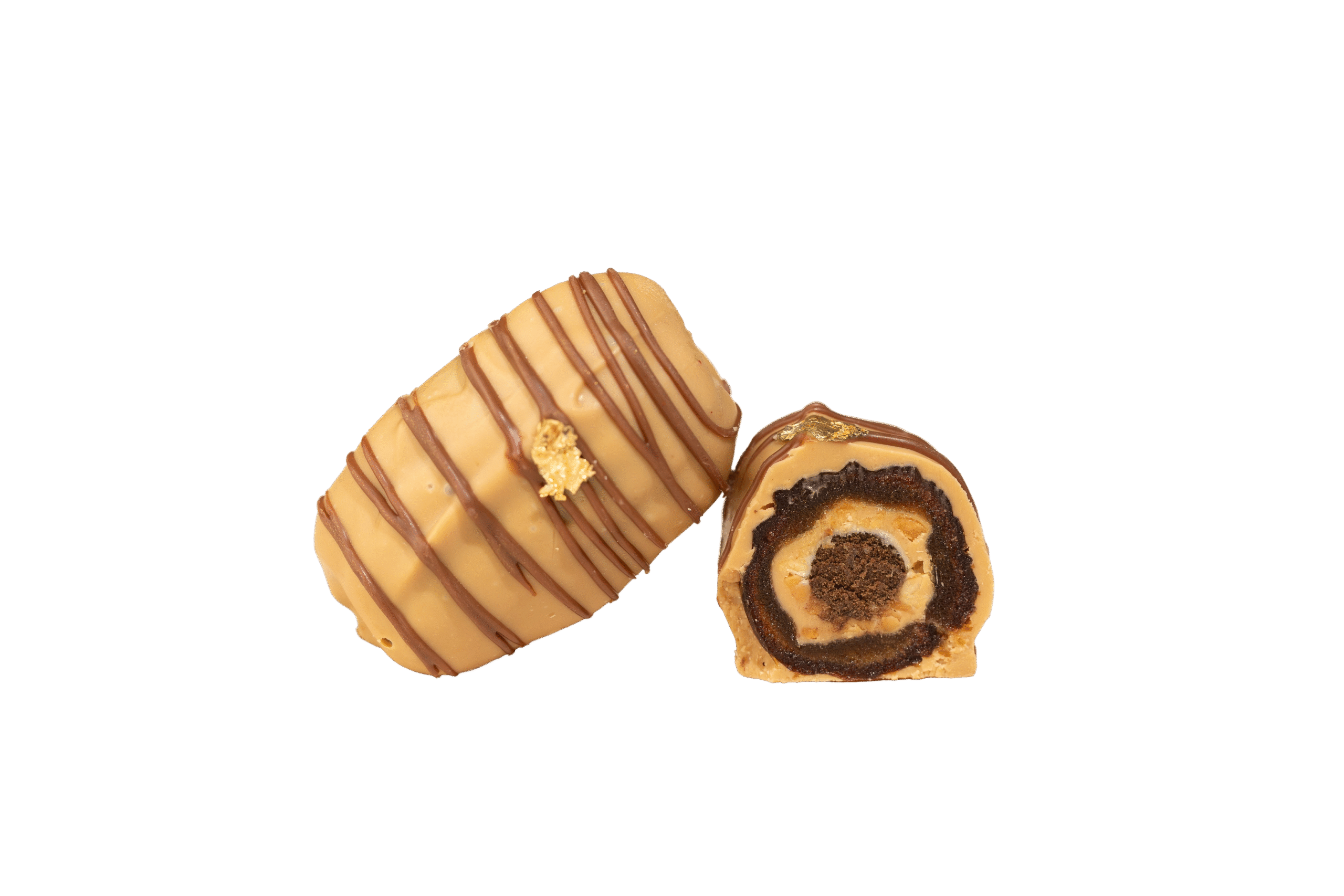 Dattes Medjool garnies d’un biscuit au cacao et de cacahuètes concassées, enrobées de chocolat blond dulcey