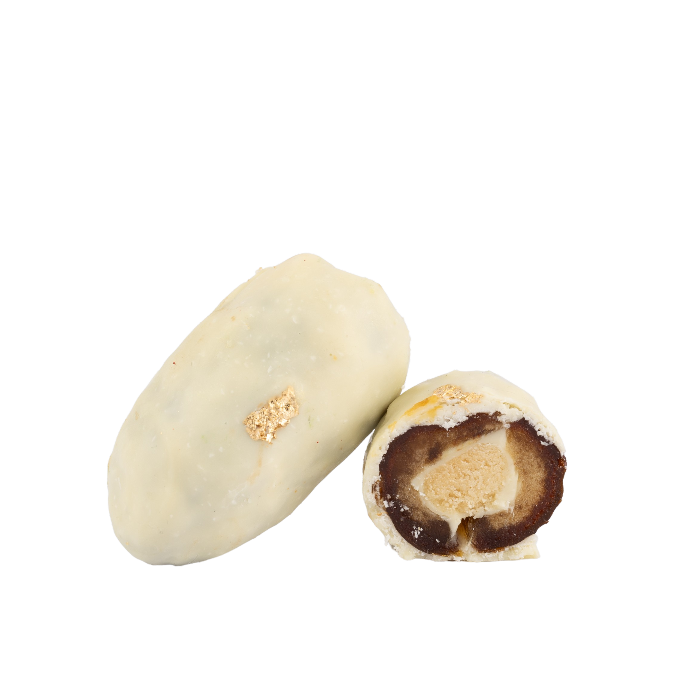 Dattes Medjool garnies d’un biscuit à la vanille et d’une crème onctueuse à la noix de coco, enrobées de chocolat blanc saupoudrées de coco râpée
